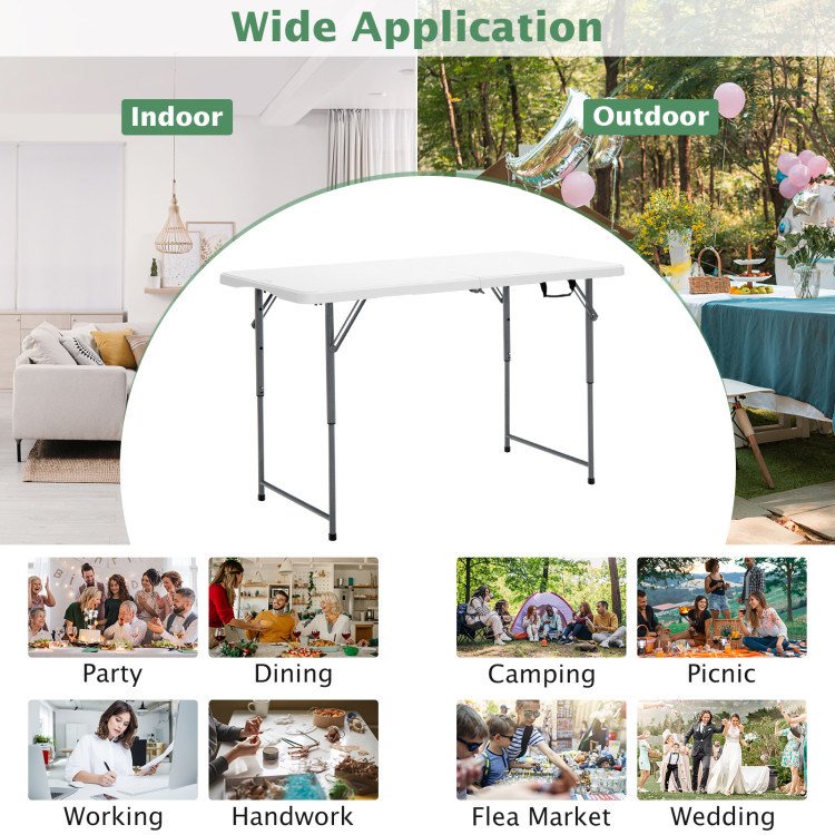 4.Indoor and Outdoor Use: Featuring height adjustable and portable design, this folding table is wide applicable to various occasions. It can serve as a kid's study table, dining table, craft table indoors or a camping table, desert table, barbecue table outdoors, etc.