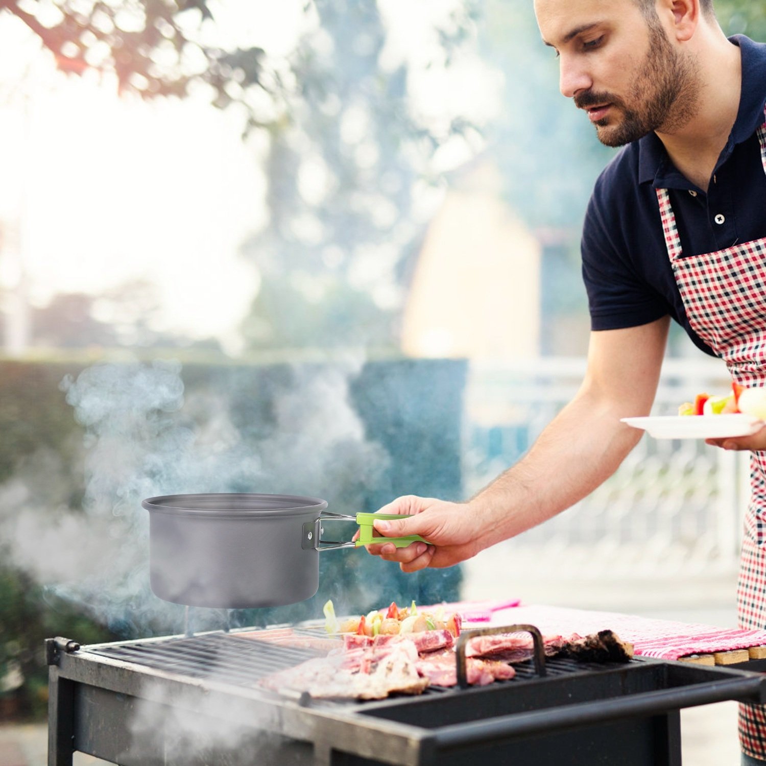 *Safe & Efficient*:The pot and pan are made of anodized aluminum; which is lightweight and fast in heat conduction. It’s easier to clean; transport and carry; money and time saving. Besides; the foldable handles at the side are heat-resistant and skid-proof; which can effectively avoid burning hands. Made of food-grade plastic; the spoon and bowls are safe and durable.