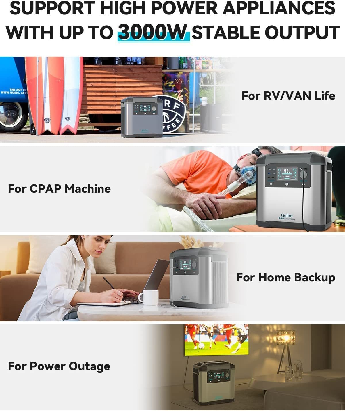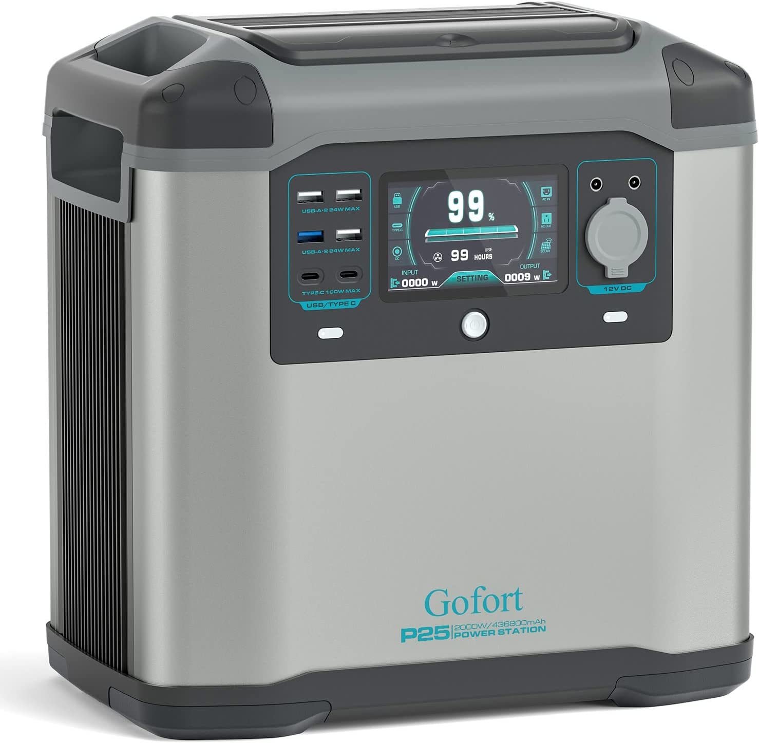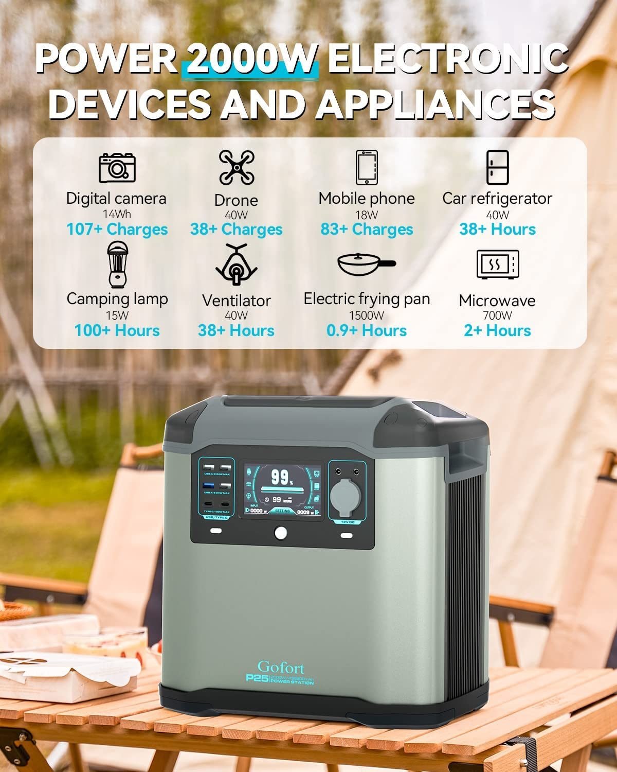 3.[1573Wh/2000W & 13 Charging Outputs]: Gofort P25 solar generator featured with a wide range of output options, including 4 x pure sine wave AC outlets, 2 x 60W USB-C ports, 2x DC ports, 1 x QC3.0 port, power all your appliances with 2000W output, that's on par with outdoor generators without the fumes or noise. With 13 outlets and its huge output, you can power 90% of your appliances.