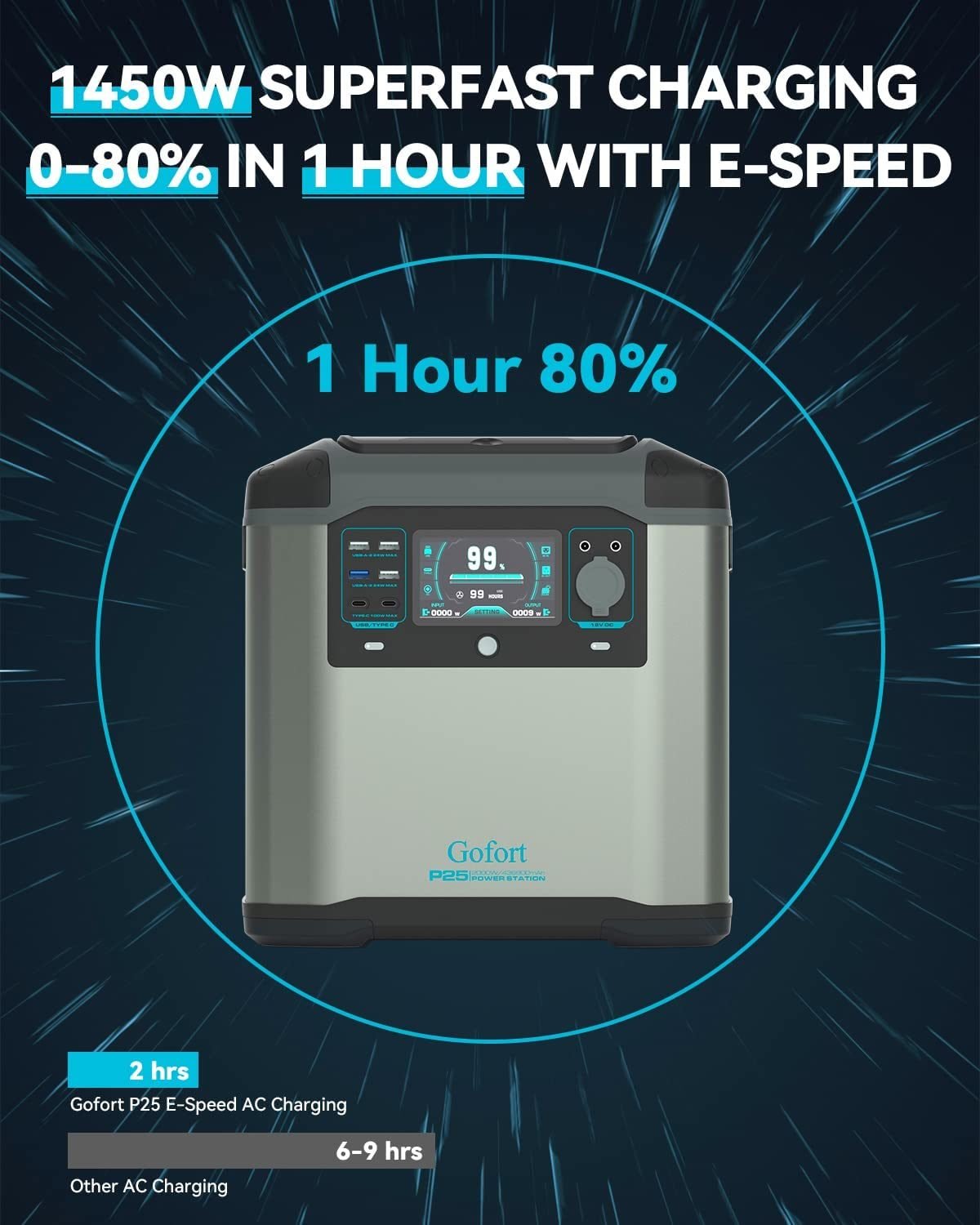 1.[1450W Max Charging Speed Input]: Gofort P25 portable power station adopts fast charging of upgraded inverter of E-SPEED and it can recharge 0-80% ultra-fast within 1 hour, and offers a full charge in just 2 hours.