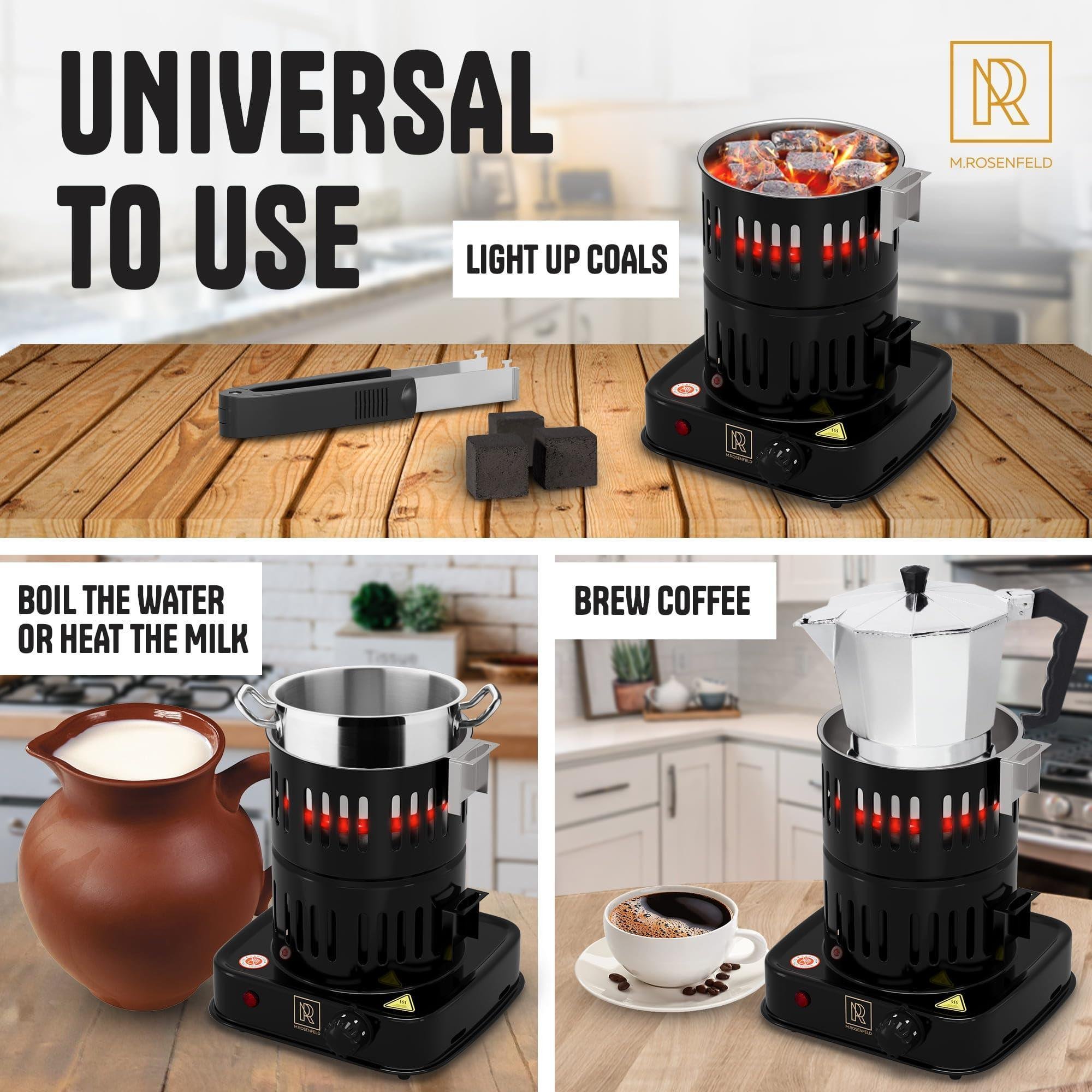 1.very fast & universal - with 800-watt this charcoal briquettes electric grill burner makes coals for anything (coconut charcoal, bamboo, wood) to burn red after 6 min & ready to use. for any kind of coals: cubes, flats etc).