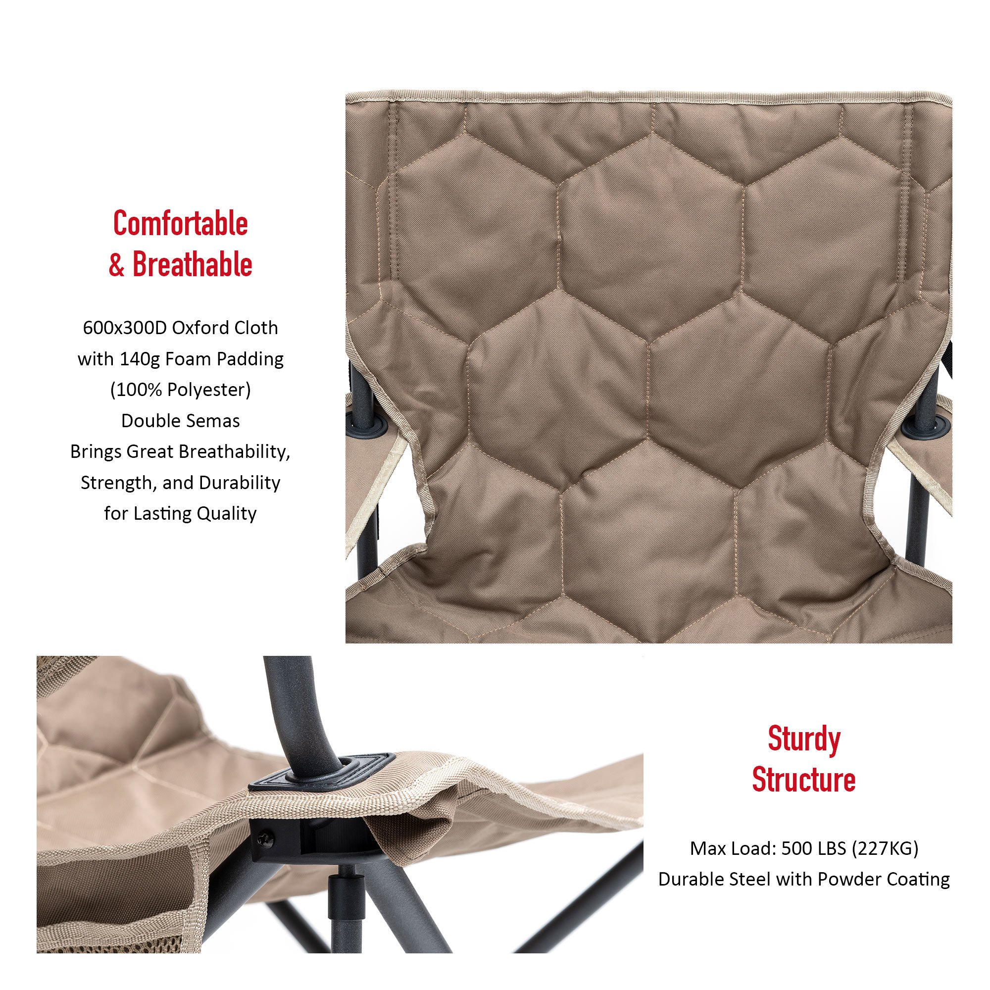 Oversized & Maximum Weight Capacity: The oversized folding chair size is 23"x37.5"x43" and the sturdy steel frame construction affords up to 300 LBS (136KG) weight capacity. This oversized & padded chair is your best partner to help you to relax and enjoy your journey.