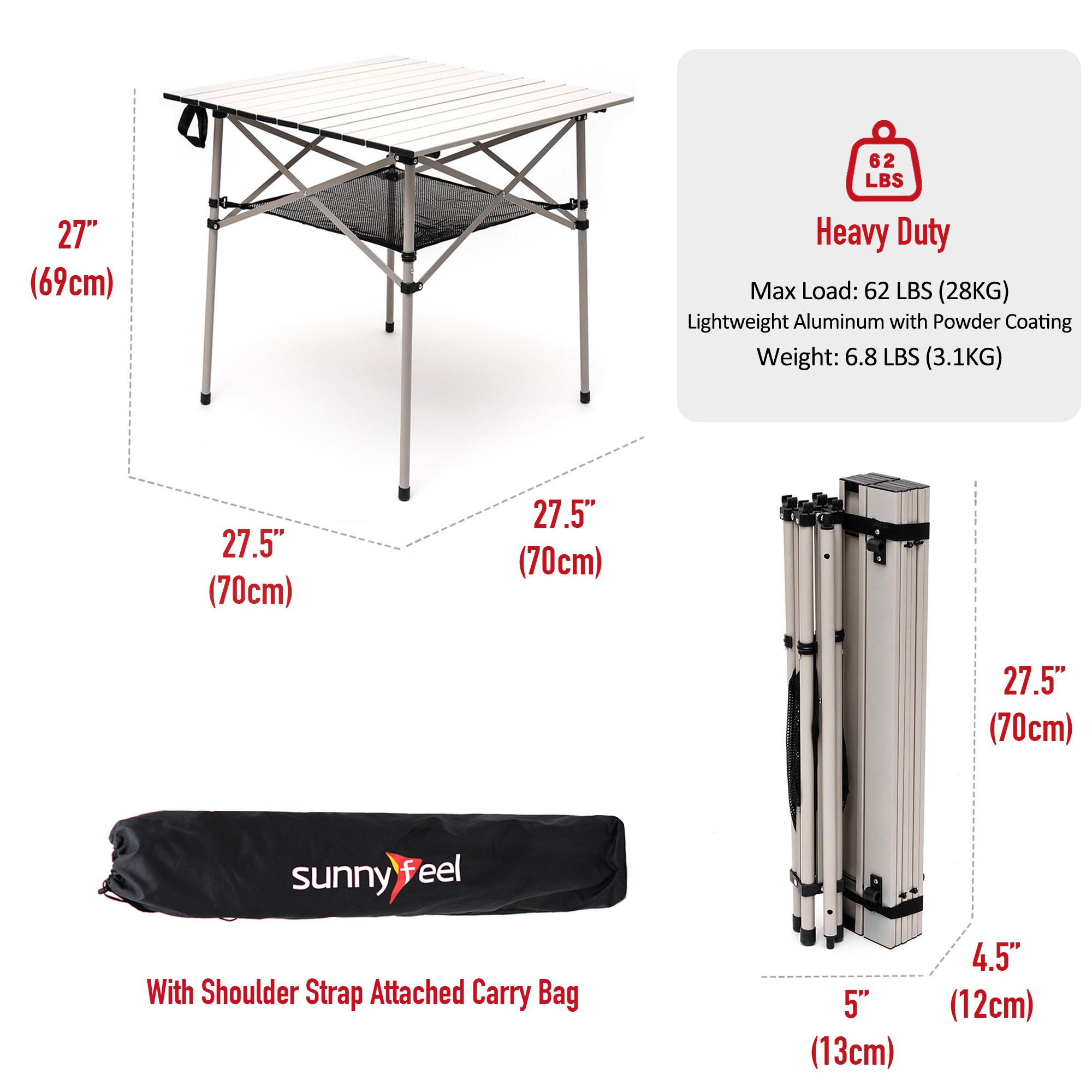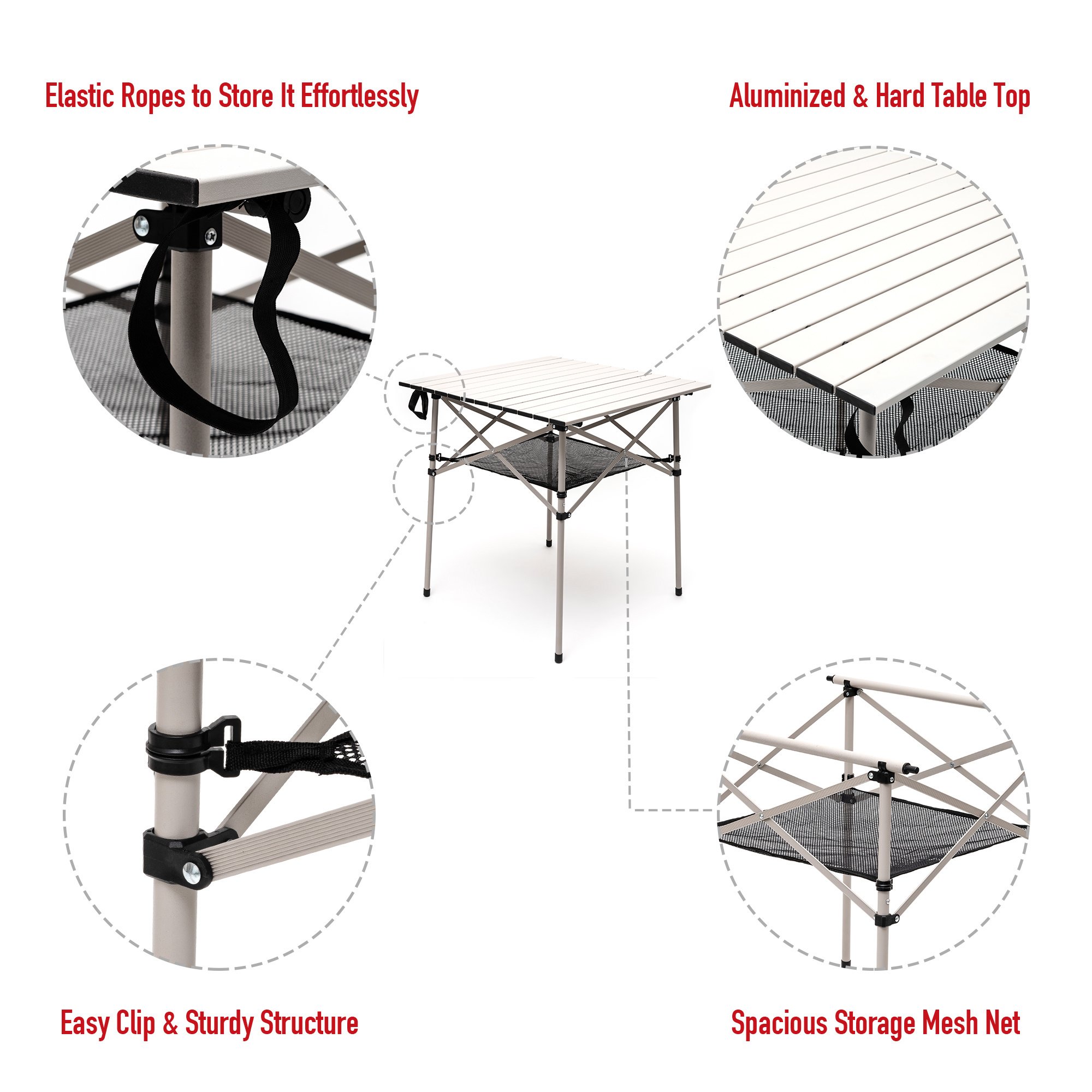 Extremely Lightweight & Convenient: The size of lightweight & sturdy aluminum folding camping table is 27.5"x27.5"x27" and weights only 6.8 LBS (3.1KG), providing the great convenience for you to travel around. The attached mesh net offers additional spacious storage for you to store your drinks, food, and other stuff.