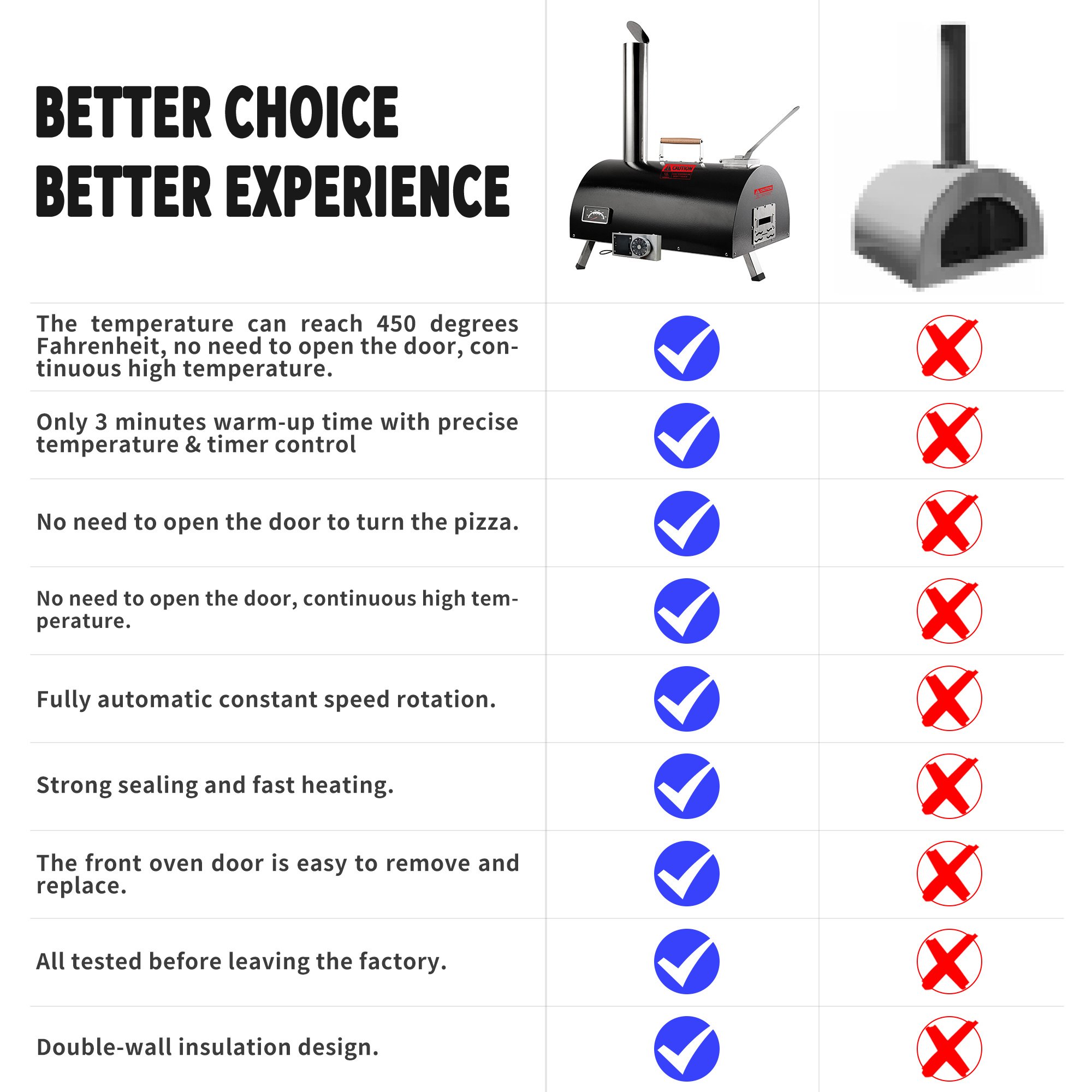 Automatic rotating turntable for even heating: The outdoor pizza oven features an automatic rotating turntable that ensures even heating, resulting in a perfectly cooked pizza with evenly baked crust and toppings.