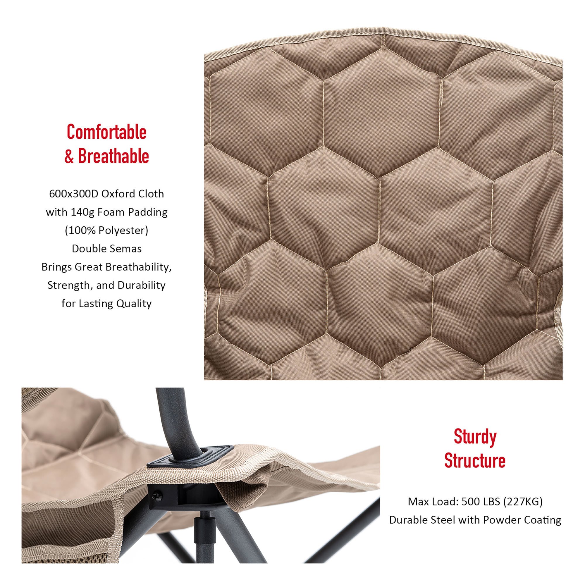 Super Oversized & Maximum Weight Capacity: The super oversized camping chairs size are 28"x42"x41", and the sturdy steel frame construction affords up to 500 LBS (227KG) weight capacity. This super oversized & padded chair high back is your best partner to help you to relax and enjoy your journey.