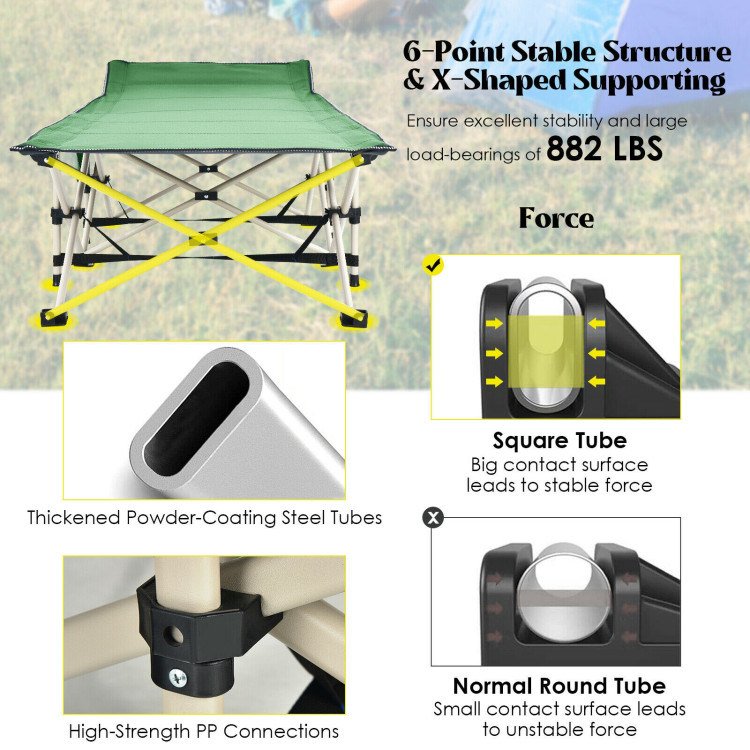 ● Stable Structure: The camping cot is designed with a 6-point stable structure and X-shaped support, ensuring excellent stability and large load-bearings of 882 lbs. Moreover, compared to normal round tubes, this cot adopts premium square tubes that provide big contact surfaces leading to stable force.