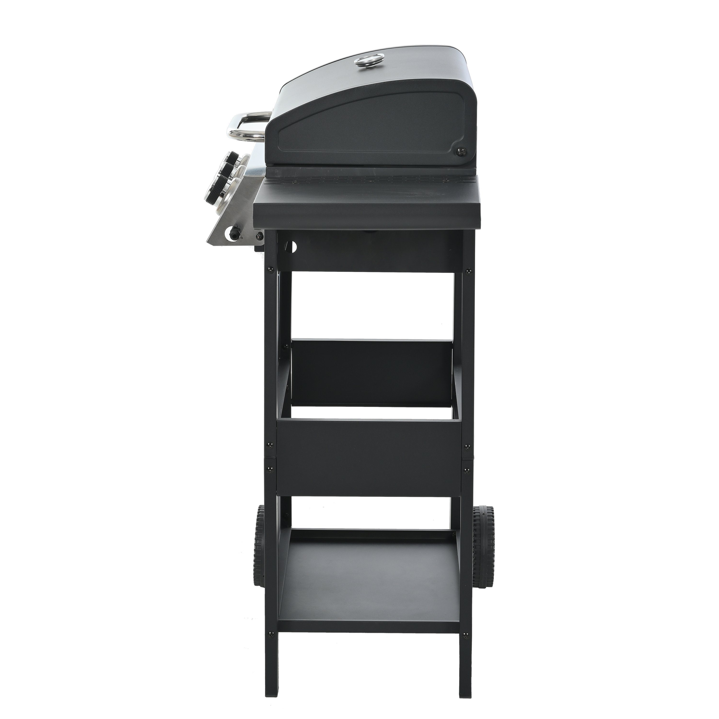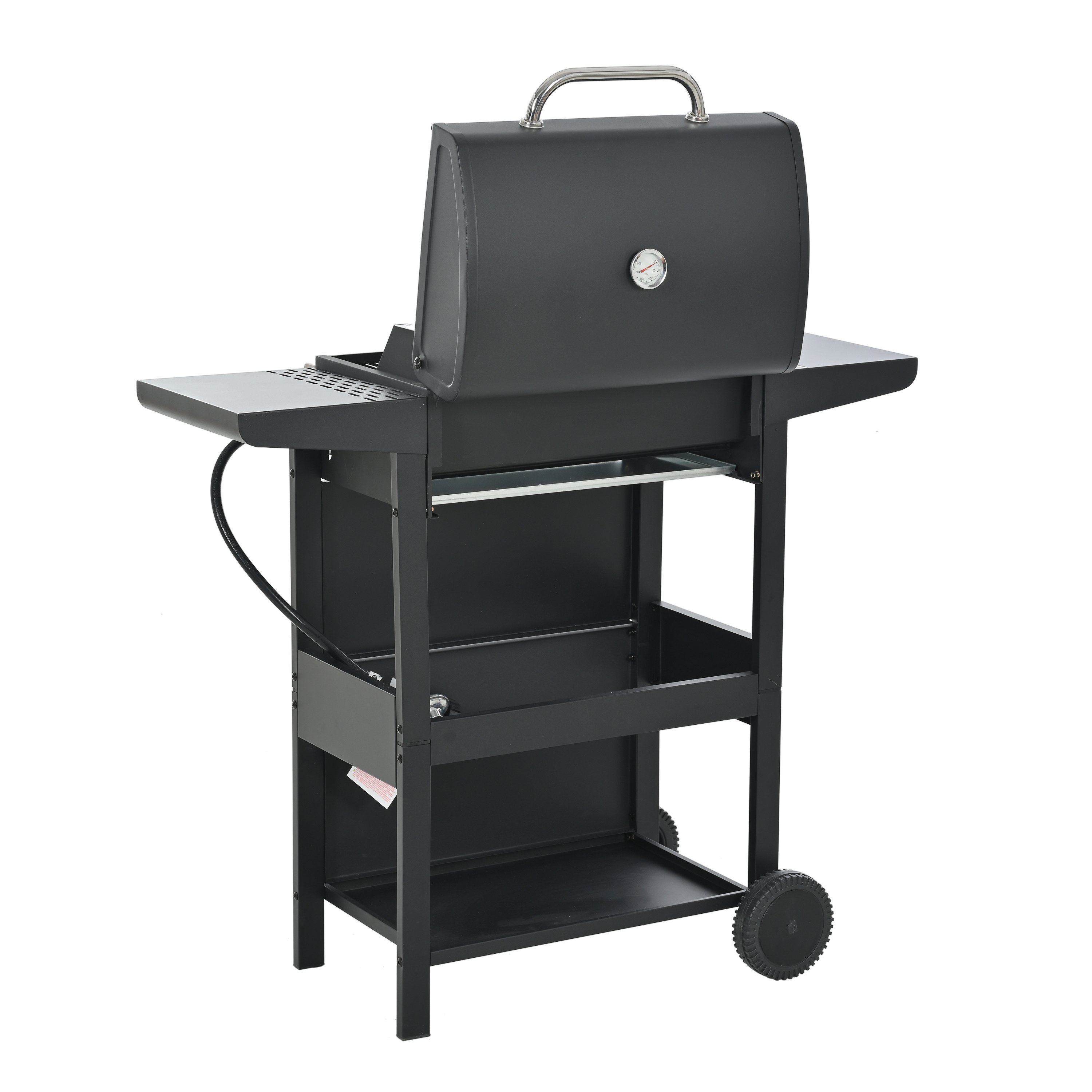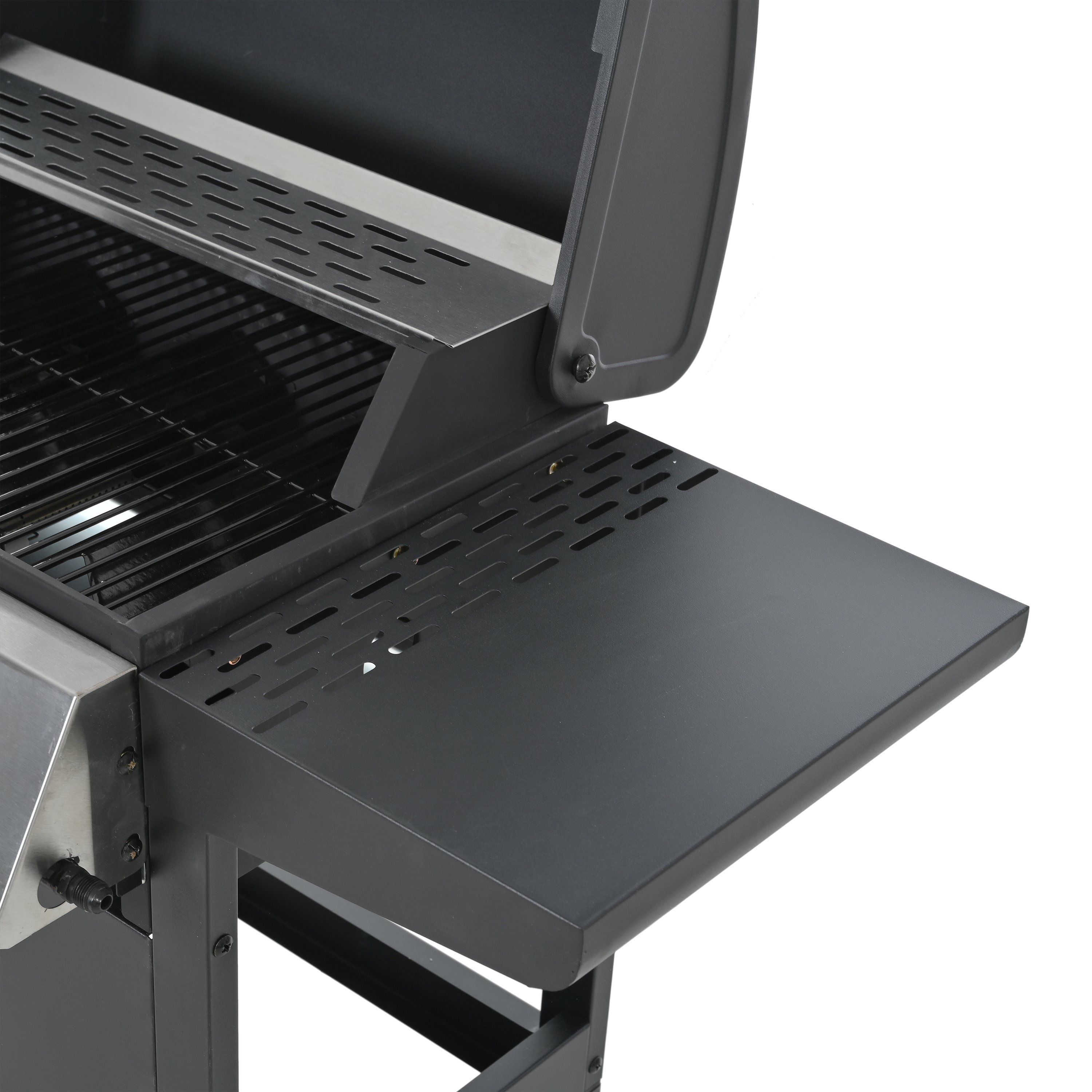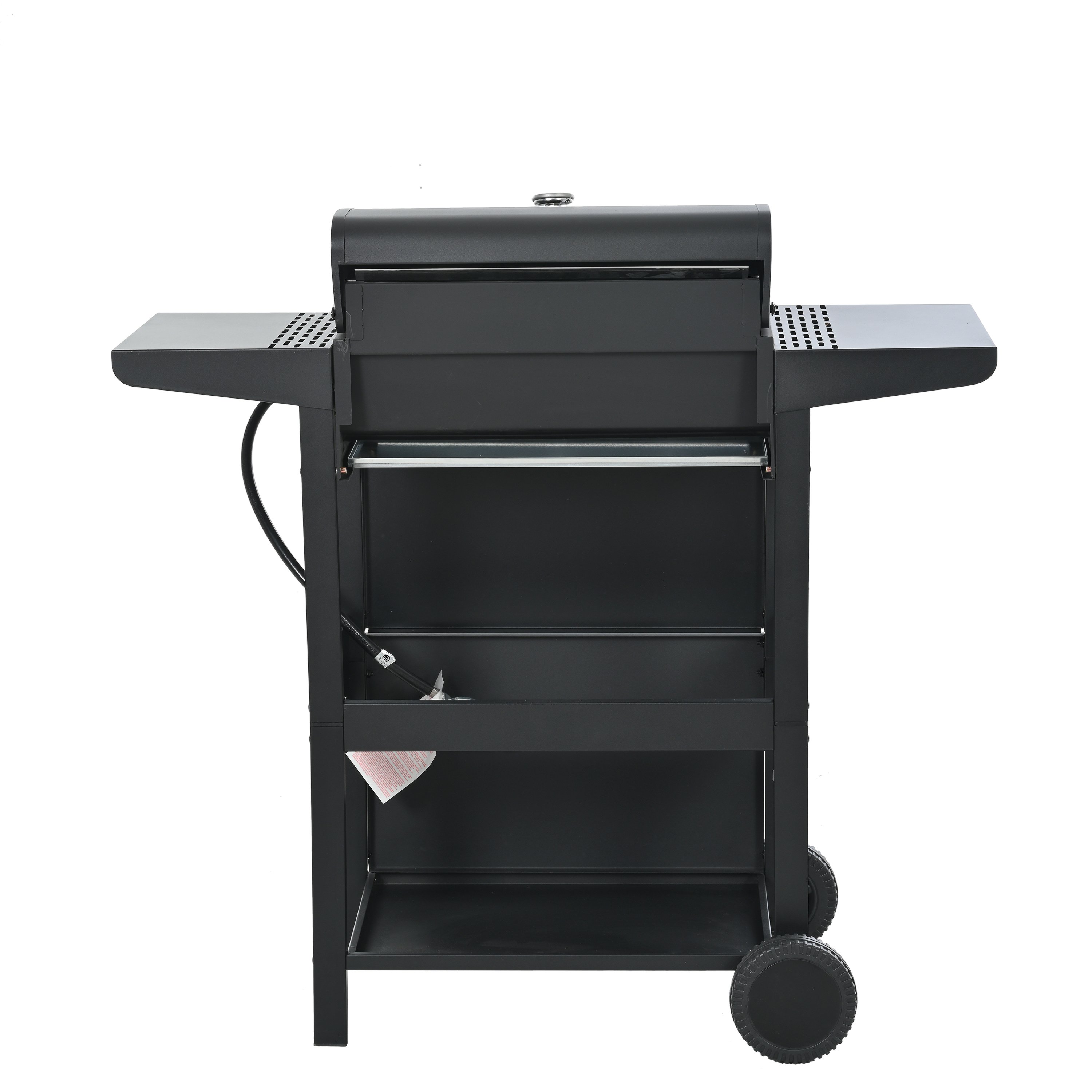 The whole Stainless steel control panel with chromium plating control knob makes this propane gas grill more study and delicate, a stainless steel handle and a built-in stainless steel thermometer on the cover lid, two tables and two wheel casters for storage and moving