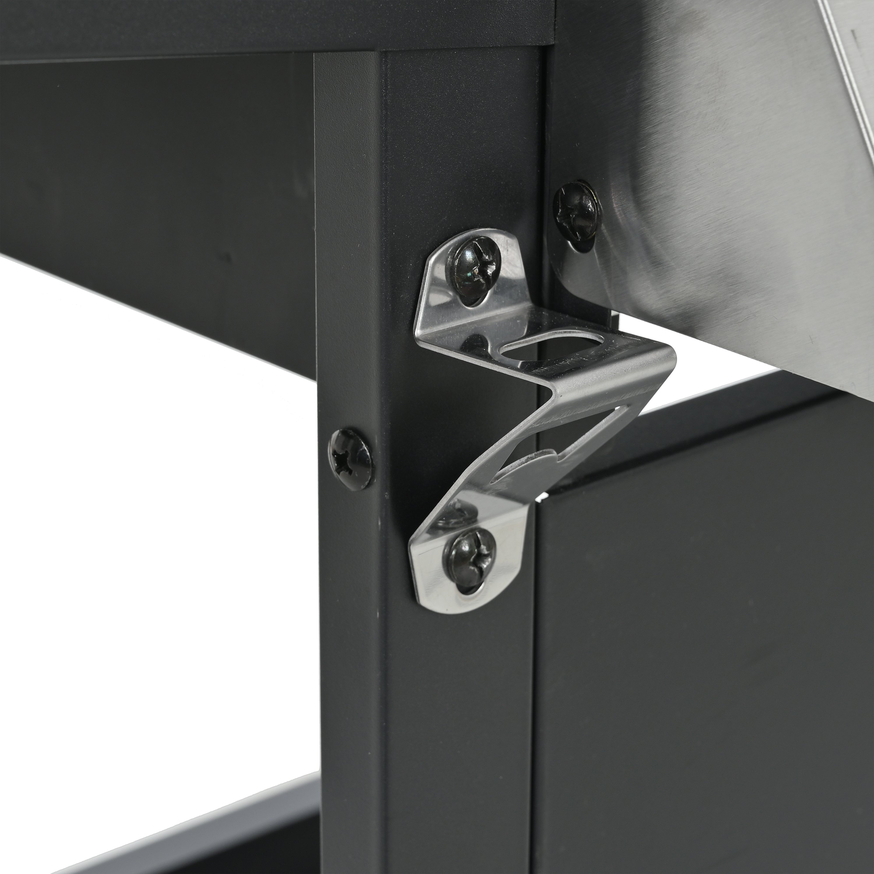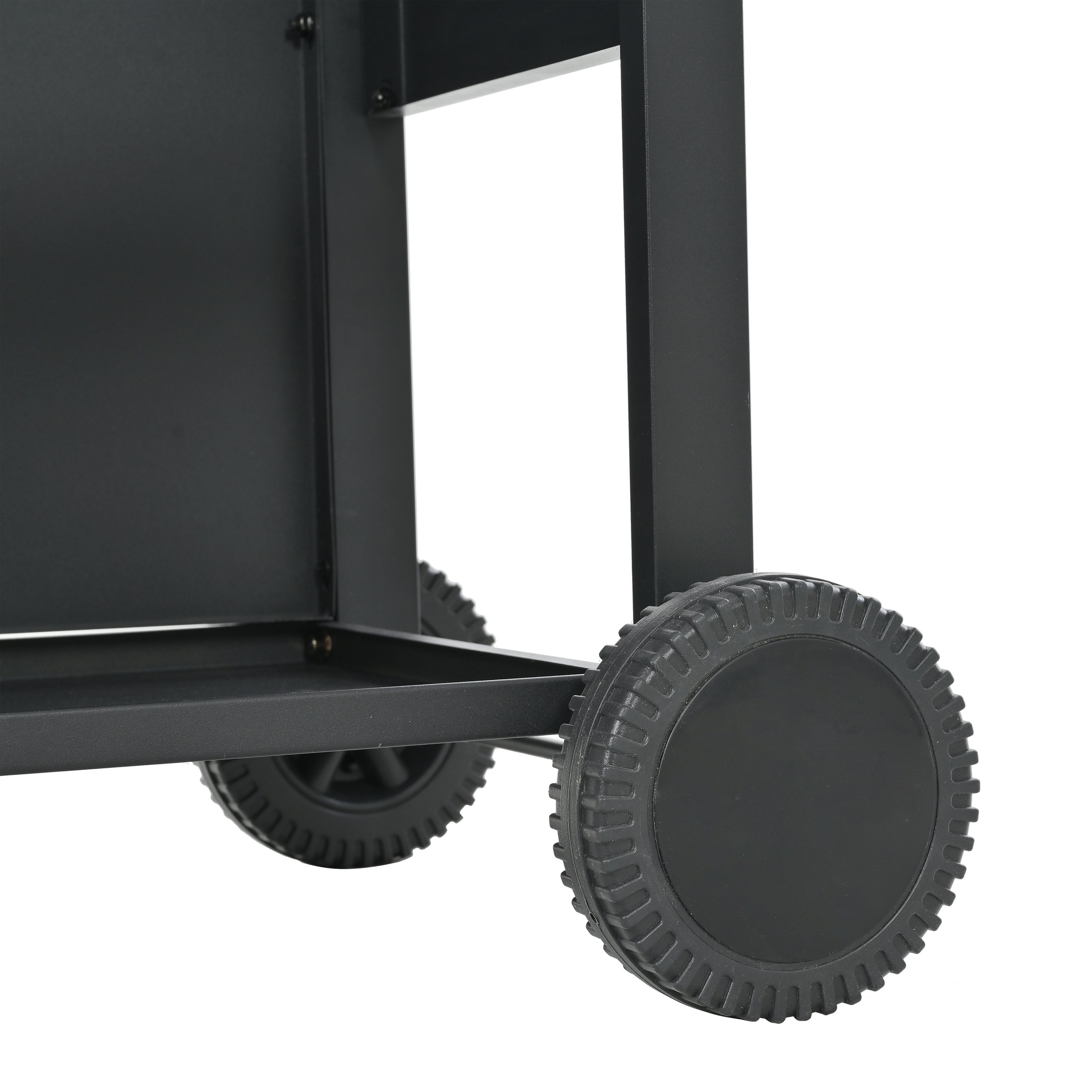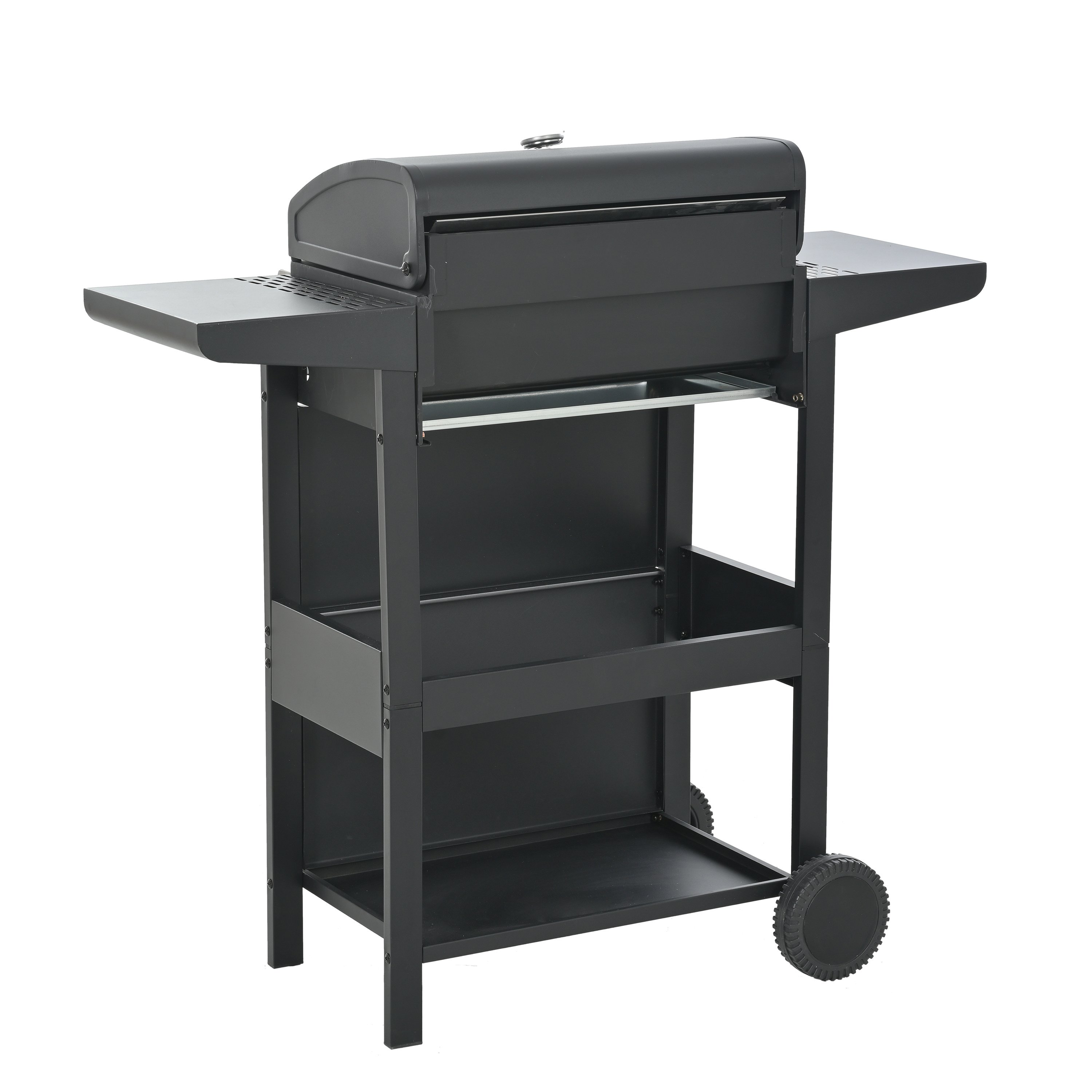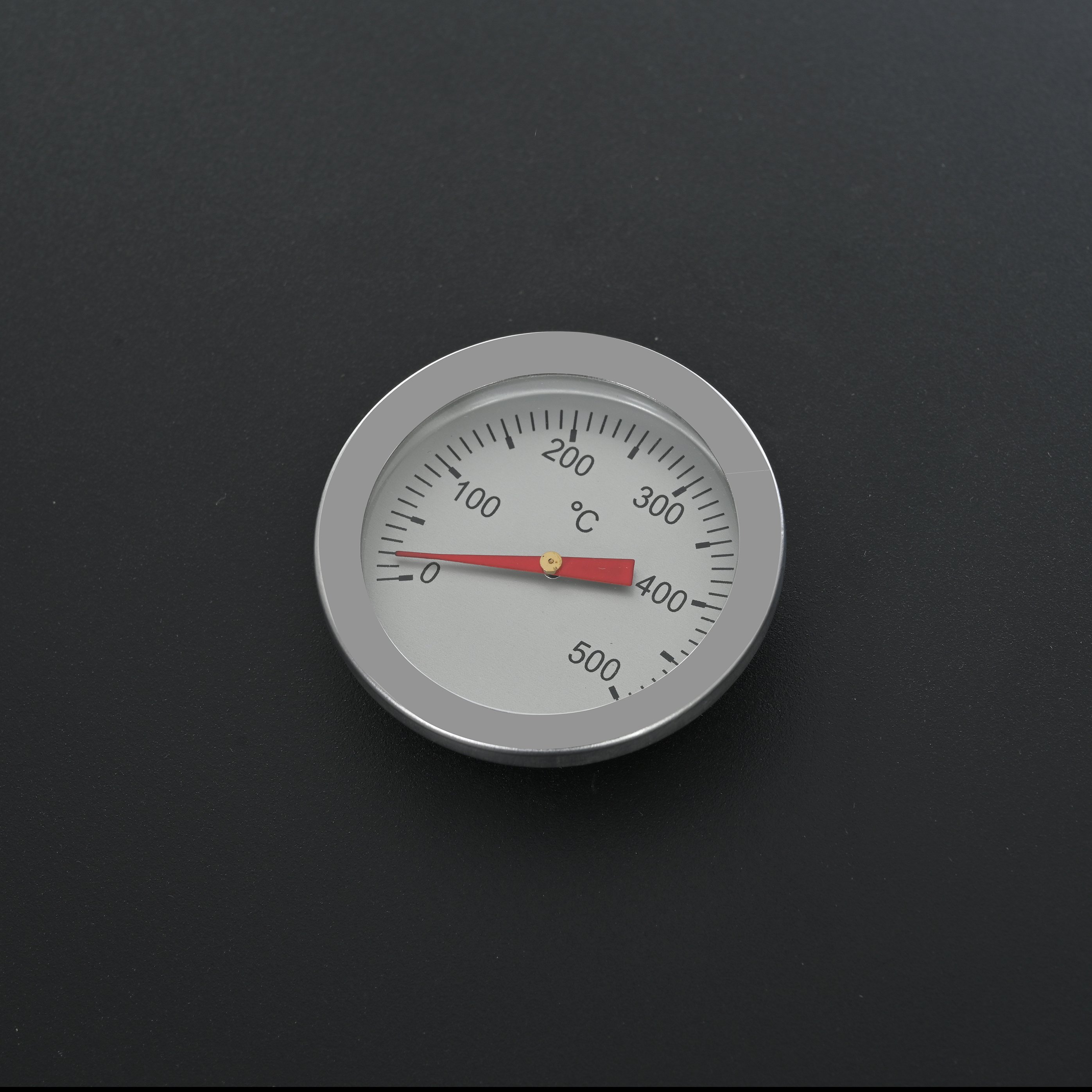 The whole Stainless steel control panel with chromium plating control knob makes this propane gas grill more study and delicate, a stainless steel handle and a built-in stainless steel thermometer on the cover lid, two tables and two wheel casters for storage and moving