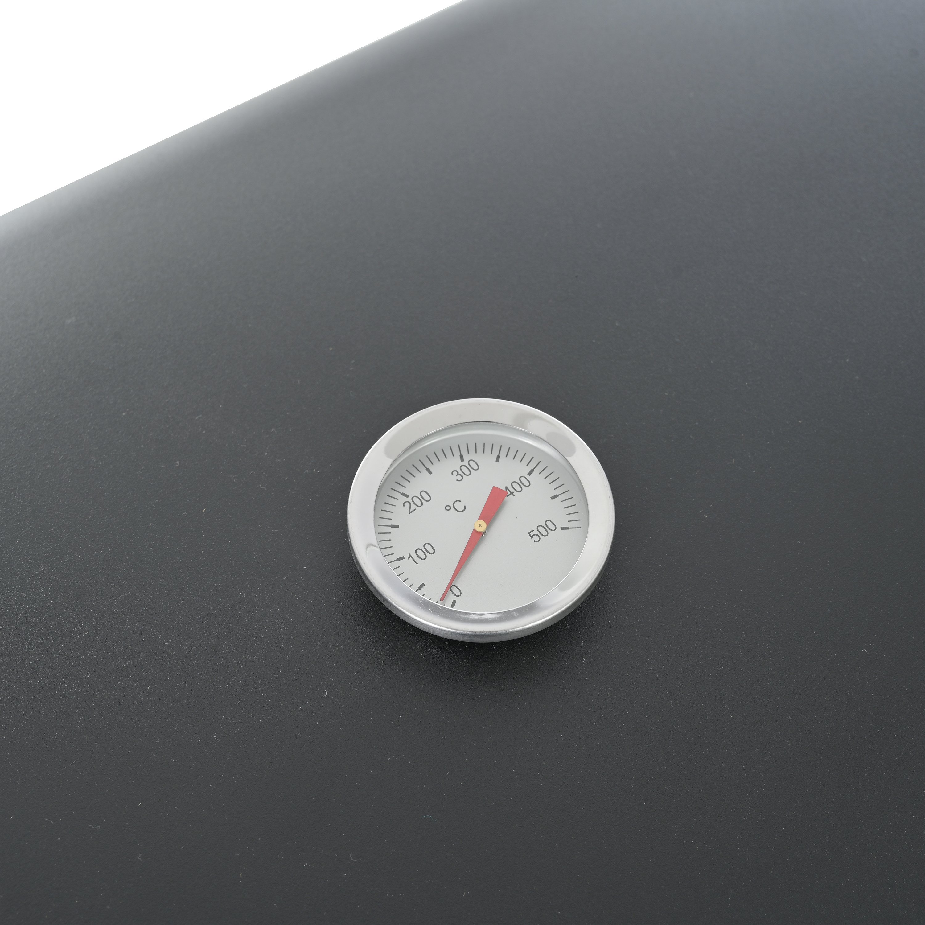 The whole Stainless steel control panel with chromium plating control knob makes this propane gas grill more study and delicate, a stainless steel handle and a built-in stainless steel thermometer on the cover lid, two tables and two wheel casters for storage and moving