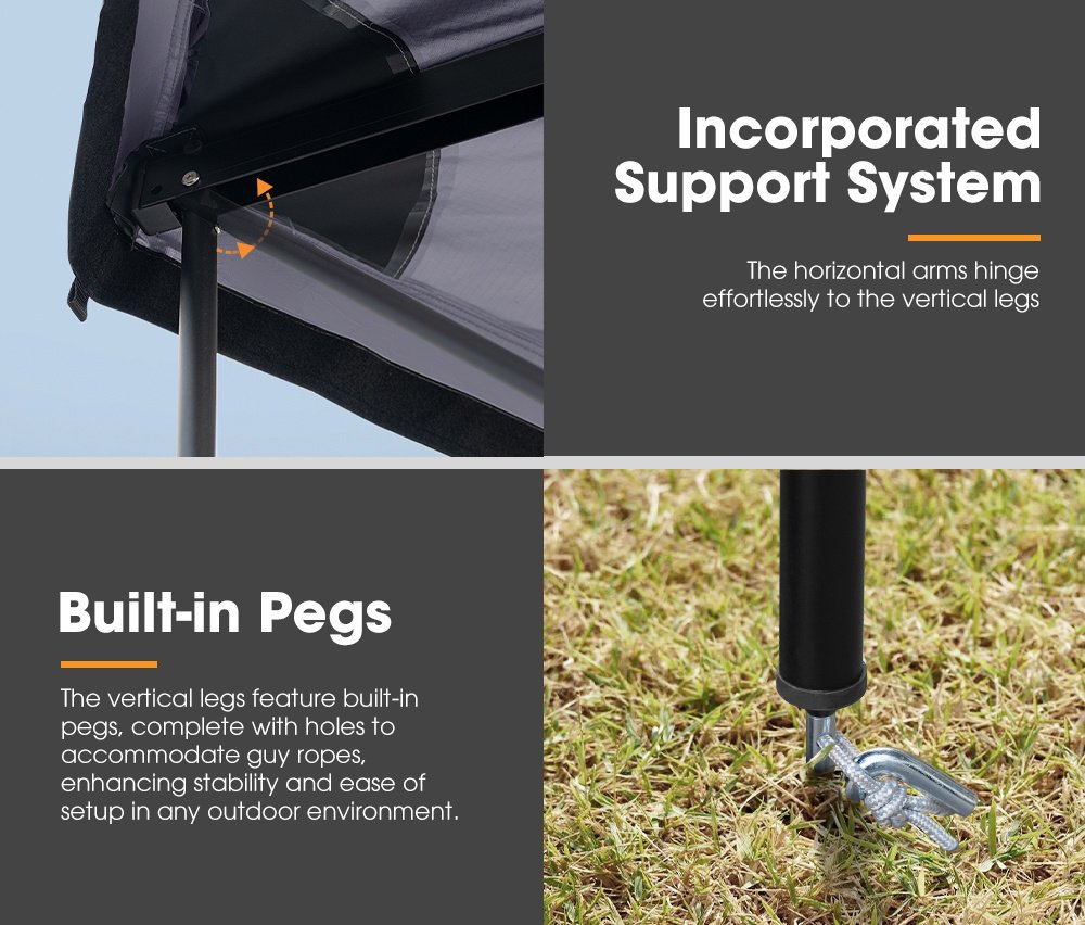 Incorporated Support System: Horizontal arms hinged to vertical legs with built-in pegs, Velcro stabilizers on arms, and guy ropes ensure stability, even in 48 knots of wind.